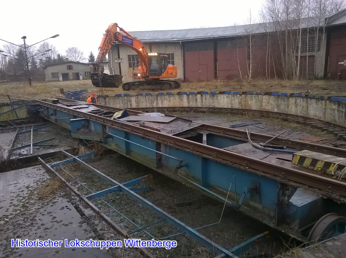 ![]() 30 years of Dampflokfreunde Salzwedel e.V. - Memories On 11 January 2016, we dismantled the turntable in Parchim with the help of a friendly company from Salzwedel. Not so that it could be turned into scrap metal. Rather, we were able to acquire the devices at the time in order to obtain a suitable turntable with a diameter of 20 metres for the planned reconstruction of locomotive shed 1 in Wittenberge. The parts of the turntable are now in storage in Wittenberge. |