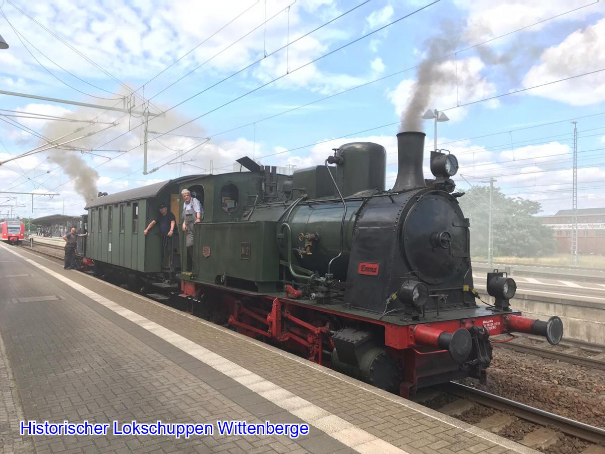 ![]() 30 years of Dampflokfreunde Salzwedel e.V. - Memories Our steam locomotive Emma and the locomotive Pritzwalk from Eisenbahngesellschaft Potsdam were also allowed to leave the museum grounds to harness a special train through the port of Wittenberge. On 3 July 2021, our little special train stands on the platform at Wittenberge main station. |