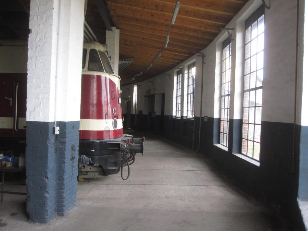 The half-roundhouse today provides undercover accommodation for our vehicles on 16 tracks. The roofed-over area is a good 2,000 square metres. It was built in the 1920s and was in service until 1996. The location was then closed and abandoned. The majority of the installations were either removed or stolen. At the last round-up, there were neither lamps nor pipes nor windows. Finally, to secure the building the Deutsche Bahn AG used perforated panels to cover all the window openings. Eventually, the roof collapsed. Then after comprehensive restoration measures started in 2011, in 2012 the building was taken into operation as the museum you see today.