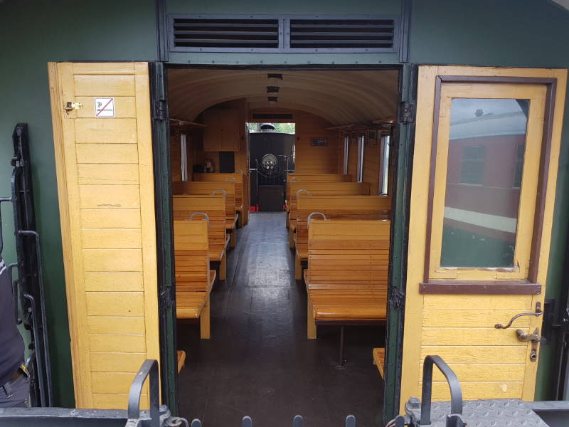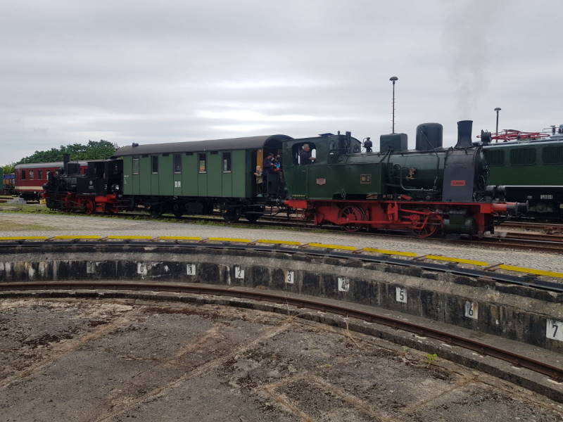 For the first time in the history of our museum we also offered trips on the museum grounds with a short museum train. The idea was actually born of necessity, in that we could not offer cab rides with our small steam locomotives due to the distancing requirement. So we coupled a historic passenger coach from 1900 between the two small locomotives, in which our visitors could experience travelling on "wood class" seating or could have a look into the driver's cabs of the locomotives from the end platforms. The car offered enough space and good ventilation.