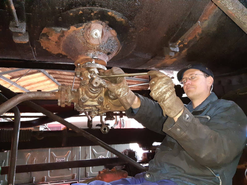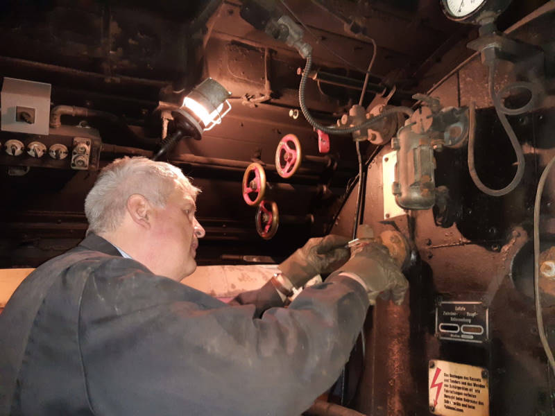 Sweat was running during further work on the steam locomotive 50 3570. Here a refurbished blowdown valve was mounted under the boiler and water level indicators were screwed on in the driver's cab.