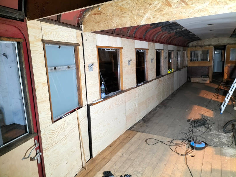 As mentioned above, work is also being done on the 197 805 trailer car. Here, the interior work is progressing. In the last few days, the new wooden wall panels were installed.