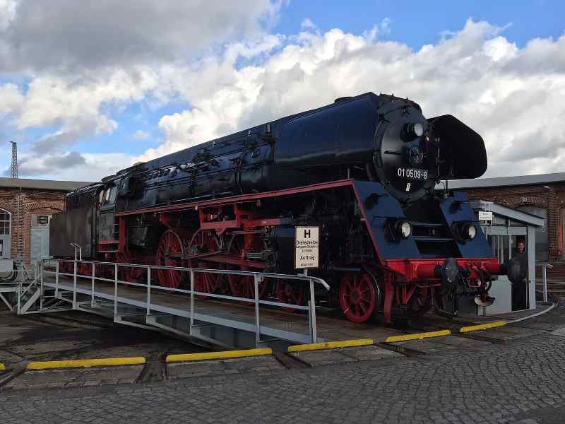 We are very pleased to announce that express steam locomotive 01 0509-8 has reached us today. The express steam locomotive was built in 1935 by Krupp and underwent extensive reconstruction in 1963 at the Reichsbahnausbesserungswerk Meiningen. It was already at home in Wittenberge between 1968 and 1976 and was one of the stars of the depot and of the entire Deutsche Reichsbahn at that time, along with its sister locomotives. It was one of the most powerful steam locomotives ever to run on German rails. Among other things, it hauled the interzonal trains between Hamburg and Berlin and was thus used in very high-quality passenger service. Today, it belongs to the Pressnitztalbahn, which uses it regularly to haul special trains throughout Germany.