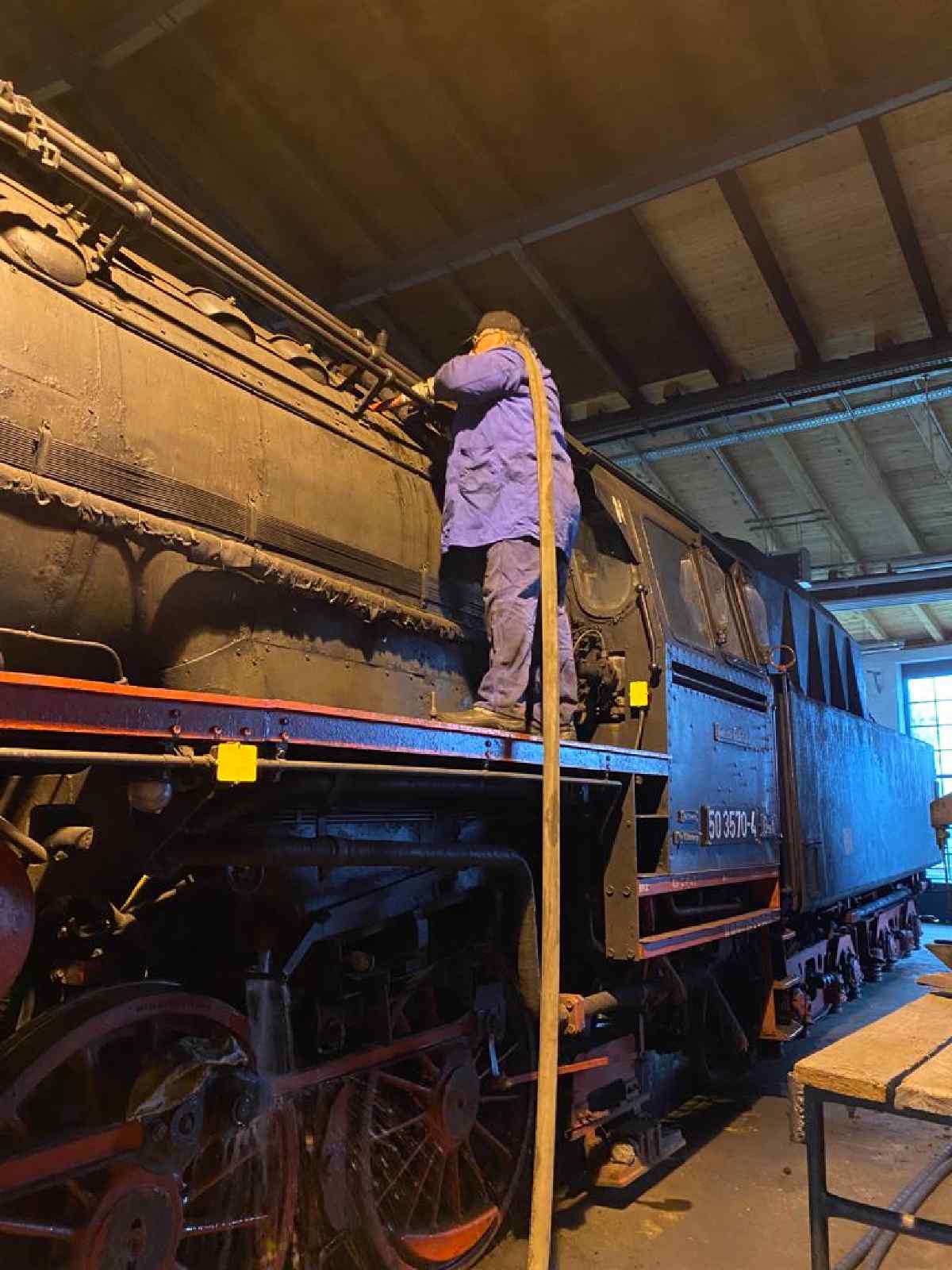 What else happened this weekend? After the end of the season, our operational vehicles have to be put into hibernation. Therefore, the boiler of the 50 3570 was washed out on Saturday. This means that the residues left behind in the boiler when the water evaporated are washed out with a sharp jet of water.