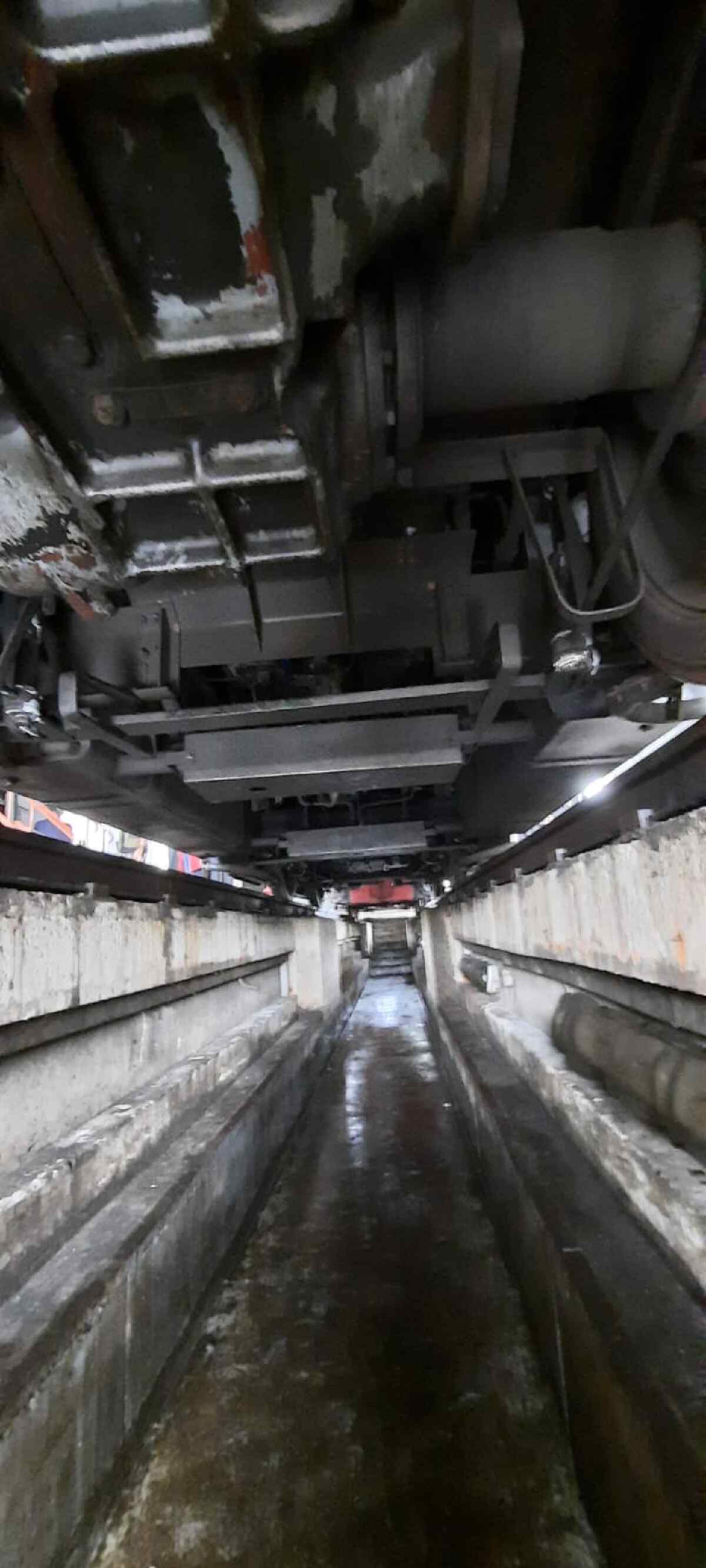 The locomotive must be lifted out of the bogies so that they and the locomotive frame can be inspected for cracks or other damage. For this purpose, we have already removed the cardan shafts that transmit the driving force from the locomotive's transmission to the two bogies and thus the axles. The next picture shows the locomotive from below.