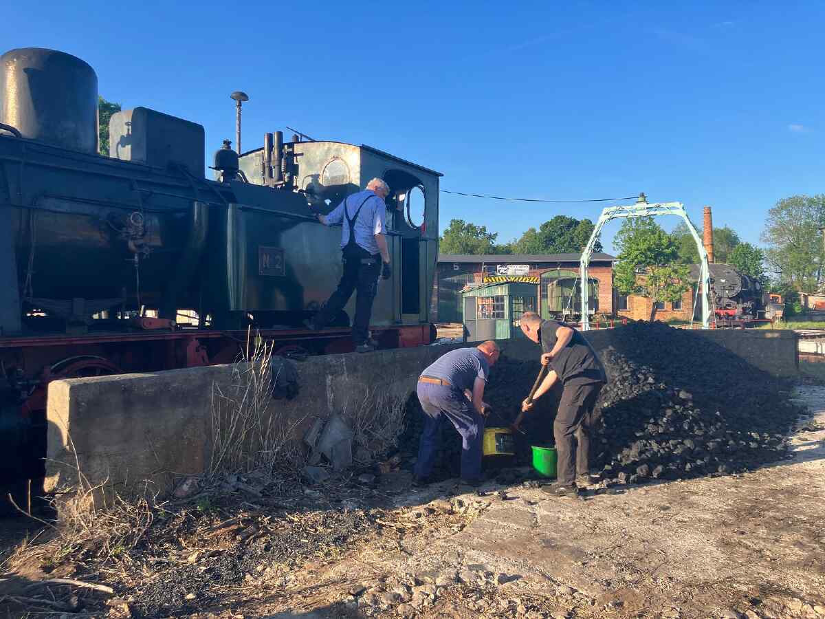 In the evening, our little one was allowed to spend the night in or in front of the Luckau engine shed. At times, she was accompanied by the Austrian steam locomotive 77.250, which is now operated by the Eurovapor association based in Würzburg.