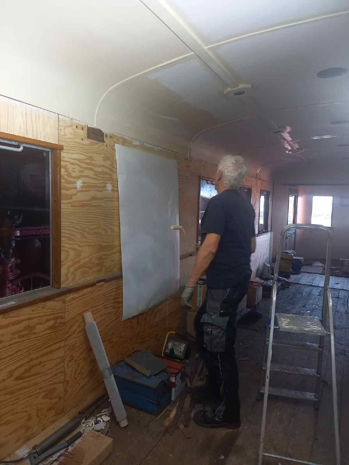 Work also continued on our coach 197 805. Now that all the ceiling panels and ceiling mouldings have been installed, the ceiling can be painted. We hope that we will soon be able to lay a new linoleum covering on the floor.