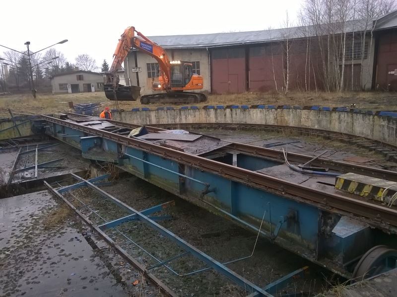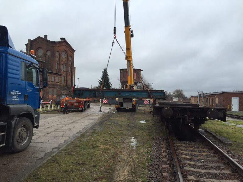 Anyone who remembers the Wittenberge depot as it was knows that there were two turntables and another locomotive shed. The shed was designed as a full roundhouse, i.e. a completely enclosed building with an internal turntable. Unfortunately, all - or what remained of it - was demolished or scrapped at the end of the last century. Now, you can never have enough space in a museum, and some time ago a plan was drawn up for the medium term to rebuild the turntable, the tracks and later parts of the building. And sometimes things happen sooner than you think. Thus we were able to acquire a 20-meter turntable, which was still relatively new, from the former railway depot in Parchim at short notice. This was dismantled in the last fewdays and the individual parts shipped to Wittenberge. The next move will be to recondition its components, then build a new pit. Our thanks go to all involved for the fast and uncomplicated handling. The photos were taken by Dirk Endisch on 12. and 13.1.2016.