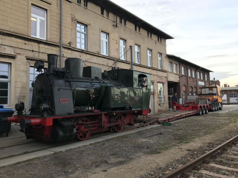 Our steam locomotive "EMMA" is back in Wittenberge. On Tuesday, September 25, at the Berlin Exhibition Centre she was winched onto a Spedition Arne Ehrig KG low-loader to be transported to Wittenberge by road. The steam engine was unloaded from the low-loader on the morning of September 26, 2018, a task completed within two hours and "EMMA" was once again in her rightful place. On the next two weekends, the engine will be got ready for her last turn of duty this year, our autumn steaming days, which take place on October 13 and 14, 2018.