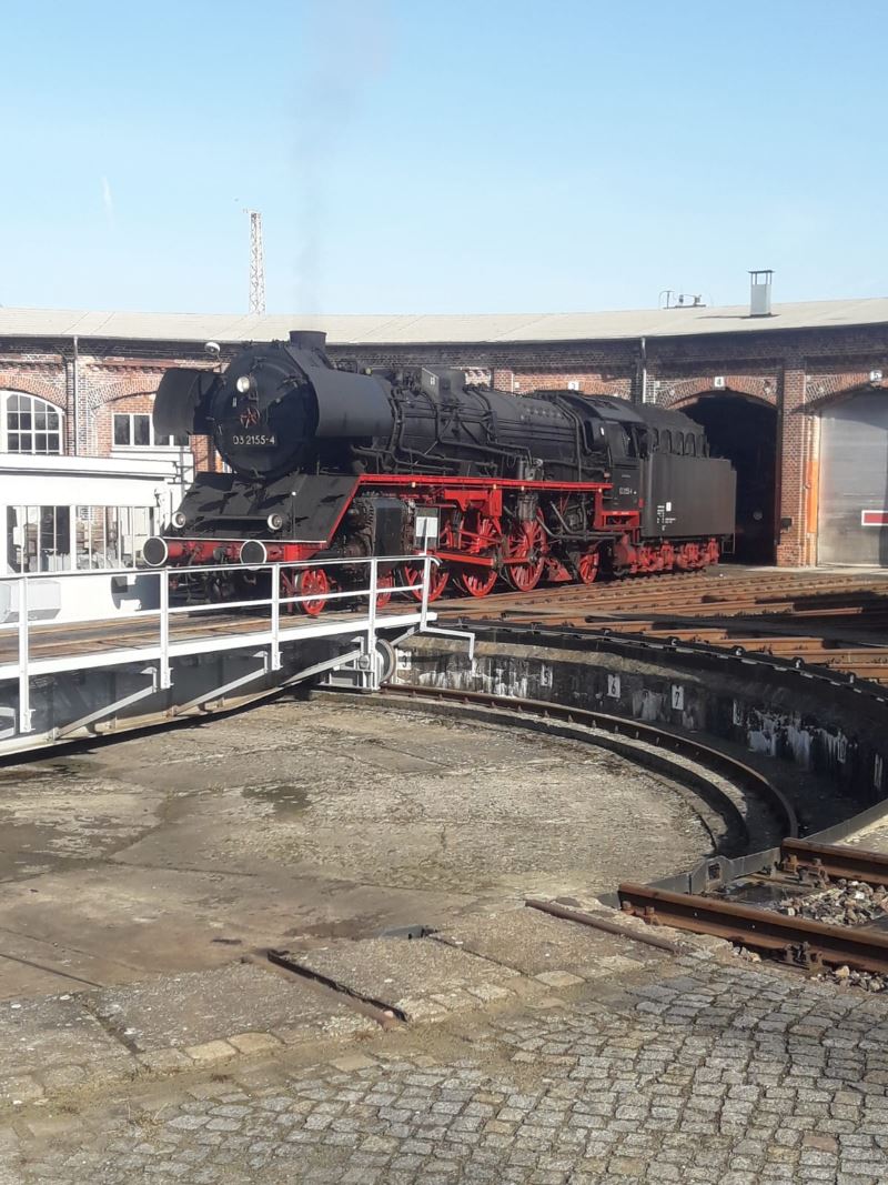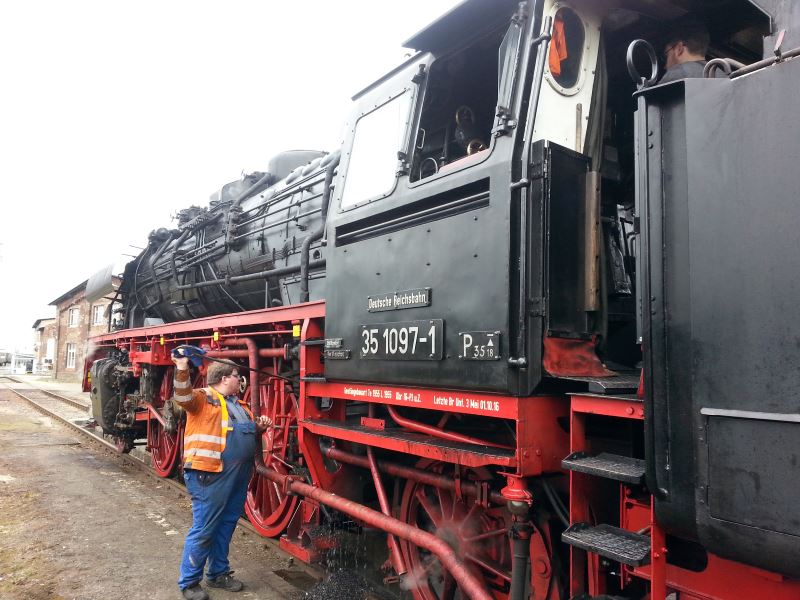 In the past few days, two steam locomotives have visited Wittenberge depot to take on coal and water and to berth some historic passenger coaches here for a few days when they were not in use between working railtours. On Monday, February 25, steam loco 03 2155 of the company WFL came to visit the premises of the historic locoshed to replenish her water supply and some three hours later, left the yard to steam off towards Berlin. She also left three passenger cars of type Bghw stabled here, which were to work a special train on March 2 from Hamburg to Wernigerode. These carriages were collected on March 1 by 35 1097 and our colleagues from Glauchau, and the empty coaches to Hamburg were piloted by diesel loco 118 770.