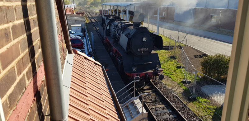 Then the locomotive was driven back to the shed and the boiler was washed out. This is necessary from time to time because the lime contained in the boiler water settles on the walls and pipes in the boiler and can cause damage if the deposits become too thick. This is why the boilers of our steam locomotives have to be flushed with high pressure.