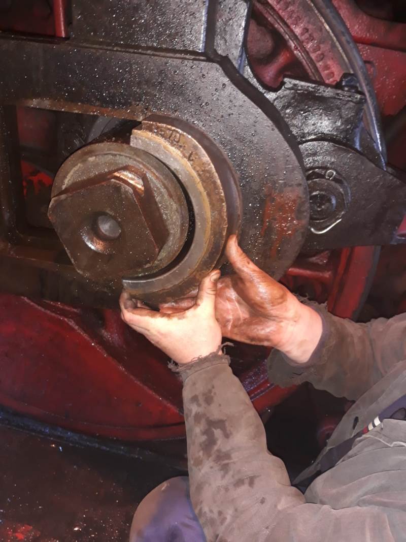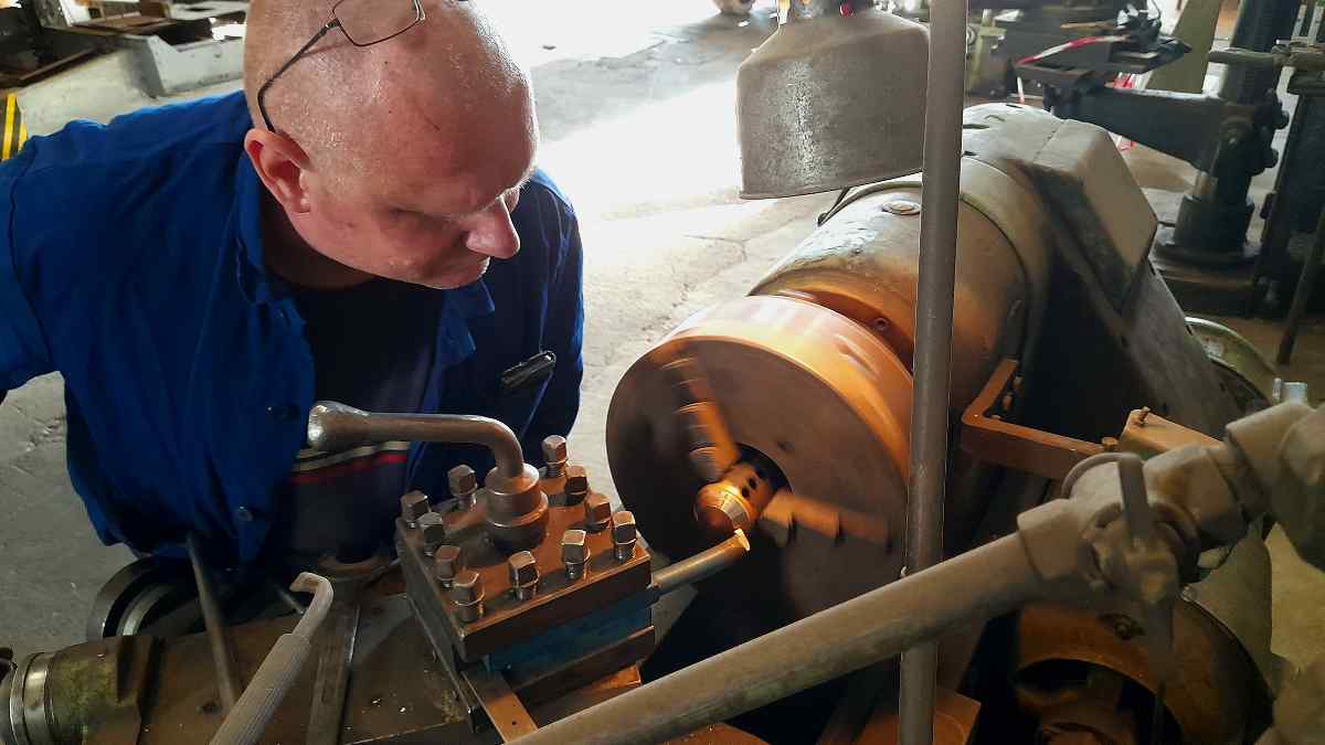 At 50 3570, the check valves have been removed. They are used to seal the lines through which fresh water can be fed into the boiler during operation. The valves consist of two parts: On the one hand, a housing with a sealing edge in it, and on the other hand, the actual valve body. The latter converges conically at the end and is pressed against the seat in the housing by the steam pressure in the boiler. If a pump is now turned on, the valve body is lifted out of the seat by the pump pressure and water can flow through the gap. The parts are made of brass to prevent them from rusting. However, brass is a relatively soft metal. Thus, closing the valve can cause a furrow to form in the valve body when it is pressed back onto the seat. This will cause the valve to leak over time. Valve bodies and seats must therefore be regularly reworked on the lathe. Here are a few pictures of the removal and machining of a valve and a comparison before and after machining.