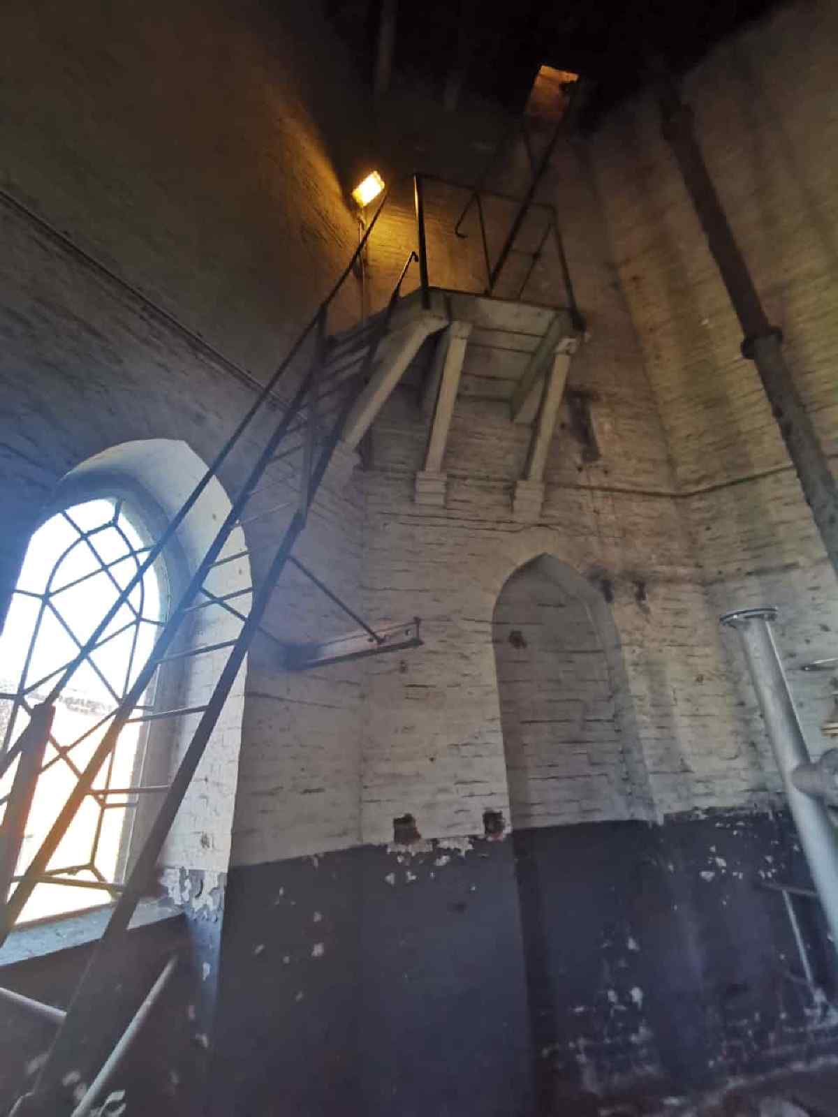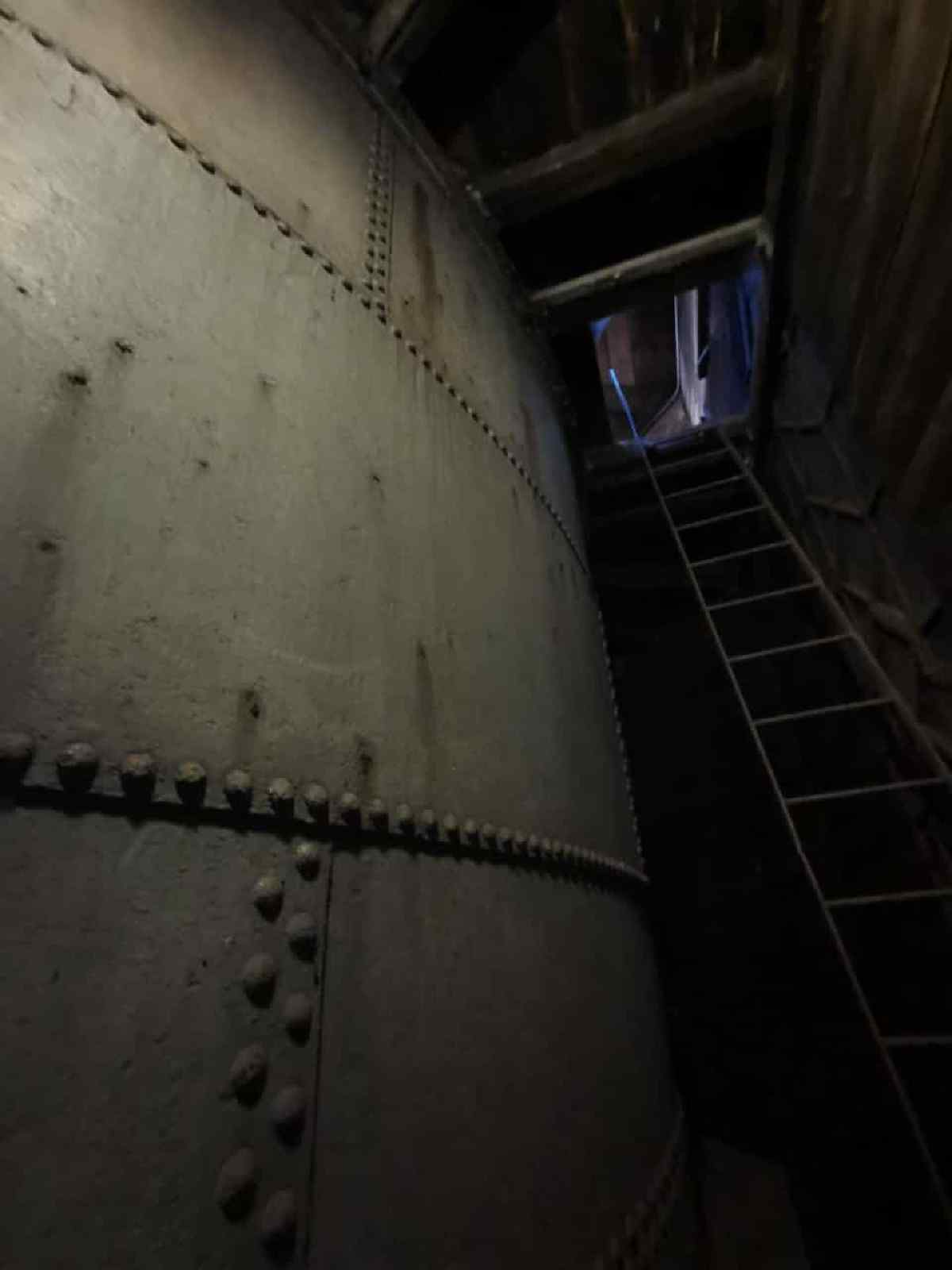 Above the false ceiling you reach the storage tank. Another staircase leads up to the top of the tank.