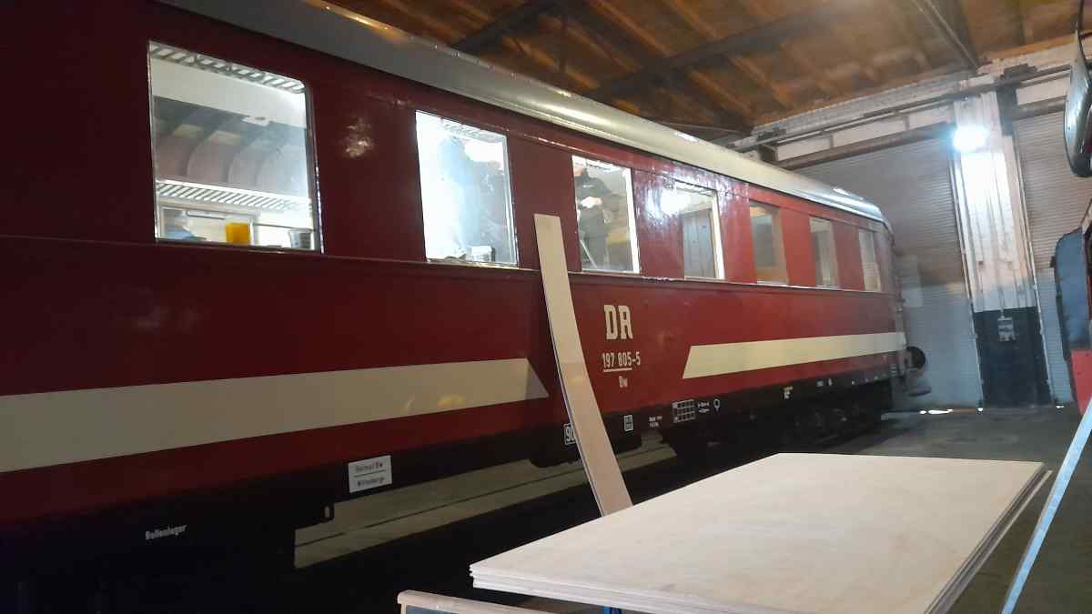 The interior work on our car 190 805 progressed with clearly visible steps. Here, the new plywood ceiling paneling could be installed.