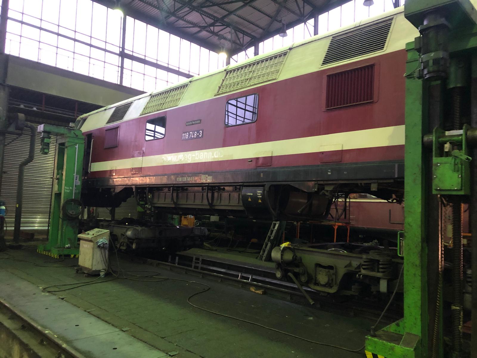 The biggest Christmas present for us is the operational refurbishment of diesel locomotive 118 748-3, which - as already reported - has been taken to a workshop in Klostermannsfeld for a general overhaul. The work here is making great progress. Some time ago, the locomotive was manoeuvred into the workshop in order to lift the locomotive body off the bogies. First of all, the bogies, including the axles and brake parts installed in them, will undergo a thorough inspection and refurbishment so that they can run smoothly in the coming years. You can already look forward with us to the moment when the locomotive is running under its own power again and can be used on the German railway network!