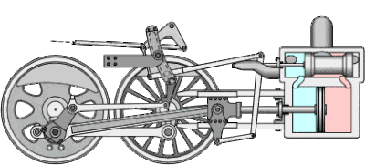 Da das alles schwer zu erklären ist, hier eine kleine Animation, die wir der Internetseite https://de.wikipedia.org/wiki/Steuerung_(Dampfmaschine) entnommen haben. Man erkennt rechts neben den Antriebsachsen der Lok den aufgeschnittenen Dampfzylinder. Oben befindet sich die Laufbuchse mit dem Schieber, unten den Antriebszylinder. Je nachdem, in welche Richtung die Lok fahren soll und wie die Antriebskolben stehen, wird über die Schieber Dampf in die Antriebszylinder indiziert oder herausgelassen. Will man die Fahrtrichtung ändern, so wird der Schieber so in der Laufbuchse verschoben, dass jeweils die andere Seite des Antriebskolbens mit Frischdampf beaufschlagt wird.