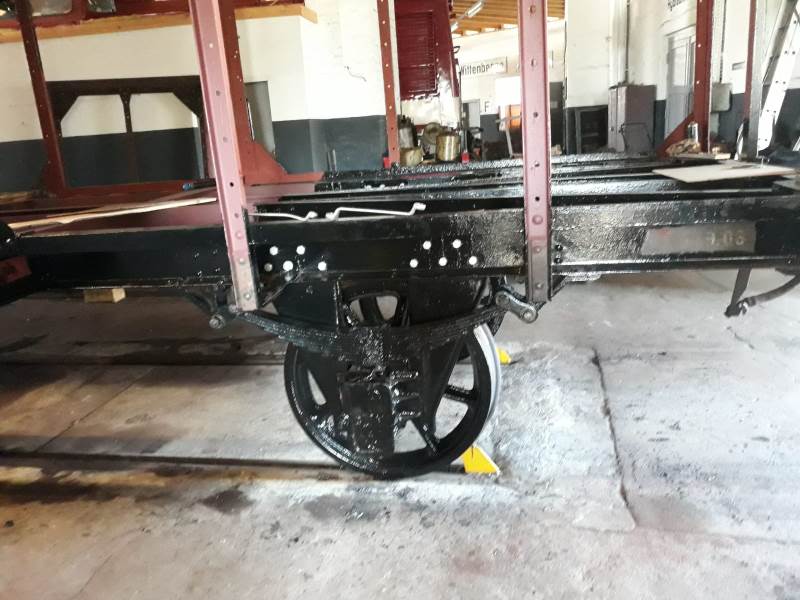 By the way, our rolling stock are also making good progress. Our G10 covered wagon is making good progress. It should actually have wooden board walls and a wooden floor. However, since the wood had rotted, it was all removed. Since the wagon is now much lighter, we were able to remove the axles, derust the axle guides and the axles themselves, repaint them and put the first axle back in.