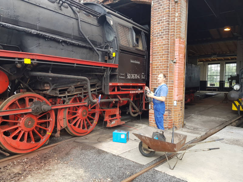 In the meantime we had to do some maintenance work on our steam locomotives. Steam locomotive 50 3570 needed some holes to be plugged in the ash box. So the industrious colleague heroically went inside the locomotive and welded the holes shut.