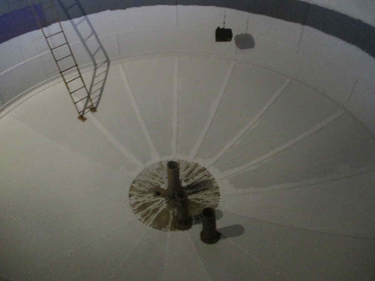 Before we can pump water into our water tower again for our event, painting for corrosion protection had to be completed. The following picture shows the bottom and side wall of the large water tank. In the middle you can see the drain into the large supply pipes to our water cranes.
