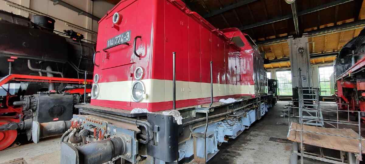 Another construction site is our diesel locomotive 114 754. As reported, the locomotive is soon to receive a general inspection, which is necessary in order to be able to use it universally on the German rail network. Such a general inspection is comparable to a regular inspection of a car, only much more extensive and labor-intensive (and therefore, unfortunately, much more expensive).