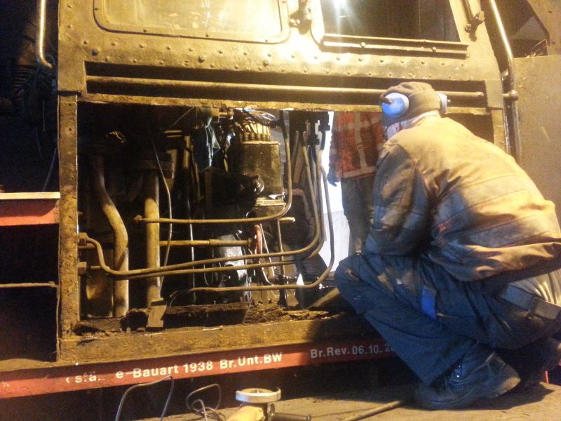 Auch an den Fahrzeugen wird gearbeitet, um sie für die kommende Saison fit zu machen. Gerade ist auch 50 3682 in Arbeit. Ihre linke Führerhausseitenwand zeigt im Bereich der Strahlpumpe Korrosionsschäden, weil immer mal Wasser und Dampf dagegen spritzt. Die Wand wird nun großflächig neu beblecht. Da die Seitenwand gerade abgebaut ist, kommt man nun auch gut an die Strahlpumpe heran. Sie wird bei der Gelegenheit durch eine aufgearbeitete Pumpe getauscht. Auch wurde der Holzfußboden auf dem Führerstand entfernt, um ihn durch neue Holzdielen zu ersetzen.
