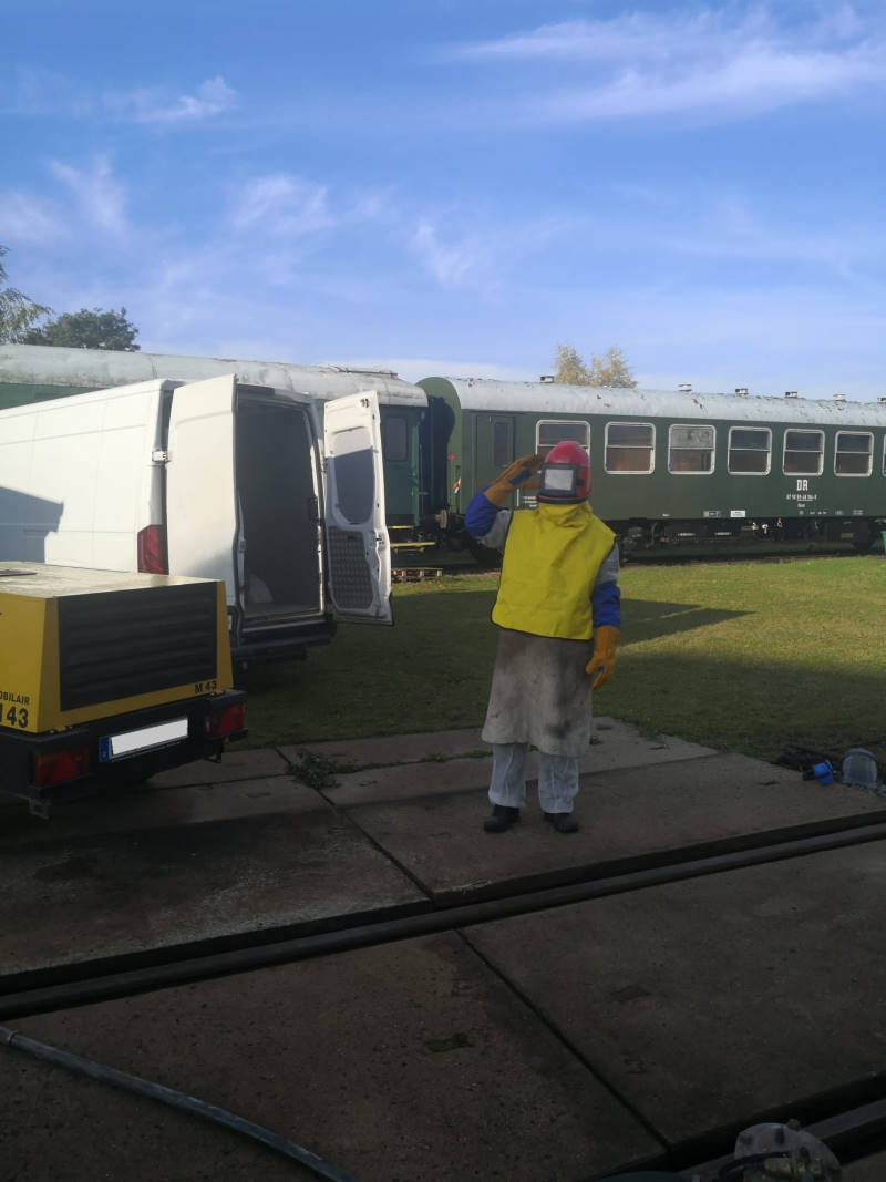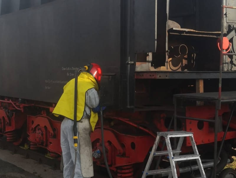 No, no Martians have landed. Rather, the tender of the locomotive was driven to our outdoor area at noon so that it could be sandblasted. This involves bombarding the metal surfaces with a granulate that removes the rust. You have to wear a protective suit for this work because the granules whirling around can cause injuries.