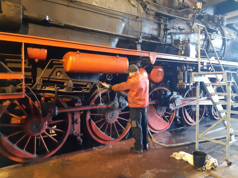 Then the locomotive was driven back to the shed and the boiler was washed out. This is necessary from time to time because the lime contained in the boiler water settles on the walls and pipes in the boiler and can cause damage if the deposits become too thick. This is why the boilers of our steam locomotives have to be flushed with high pressure.
