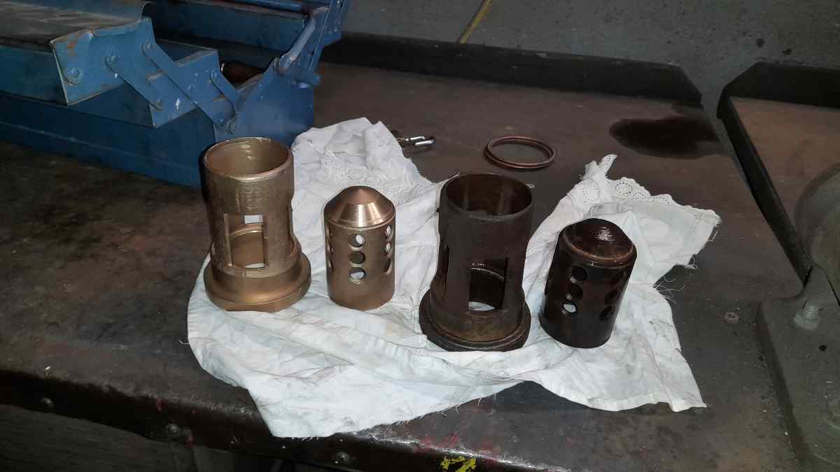 At 50 3570, the check valves have been removed. They are used to seal the lines through which fresh water can be fed into the boiler during operation. The valves consist of two parts: On the one hand, a housing with a sealing edge in it, and on the other hand, the actual valve body. The latter converges conically at the end and is pressed against the seat in the housing by the steam pressure in the boiler. If a pump is now turned on, the valve body is lifted out of the seat by the pump pressure and water can flow through the gap. The parts are made of brass to prevent them from rusting. However, brass is a relatively soft metal. Thus, closing the valve can cause a furrow to form in the valve body when it is pressed back onto the seat. This will cause the valve to leak over time. Valve bodies and seats must therefore be regularly reworked on the lathe. Here are a few pictures of the removal and machining of a valve and a comparison before and after machining.