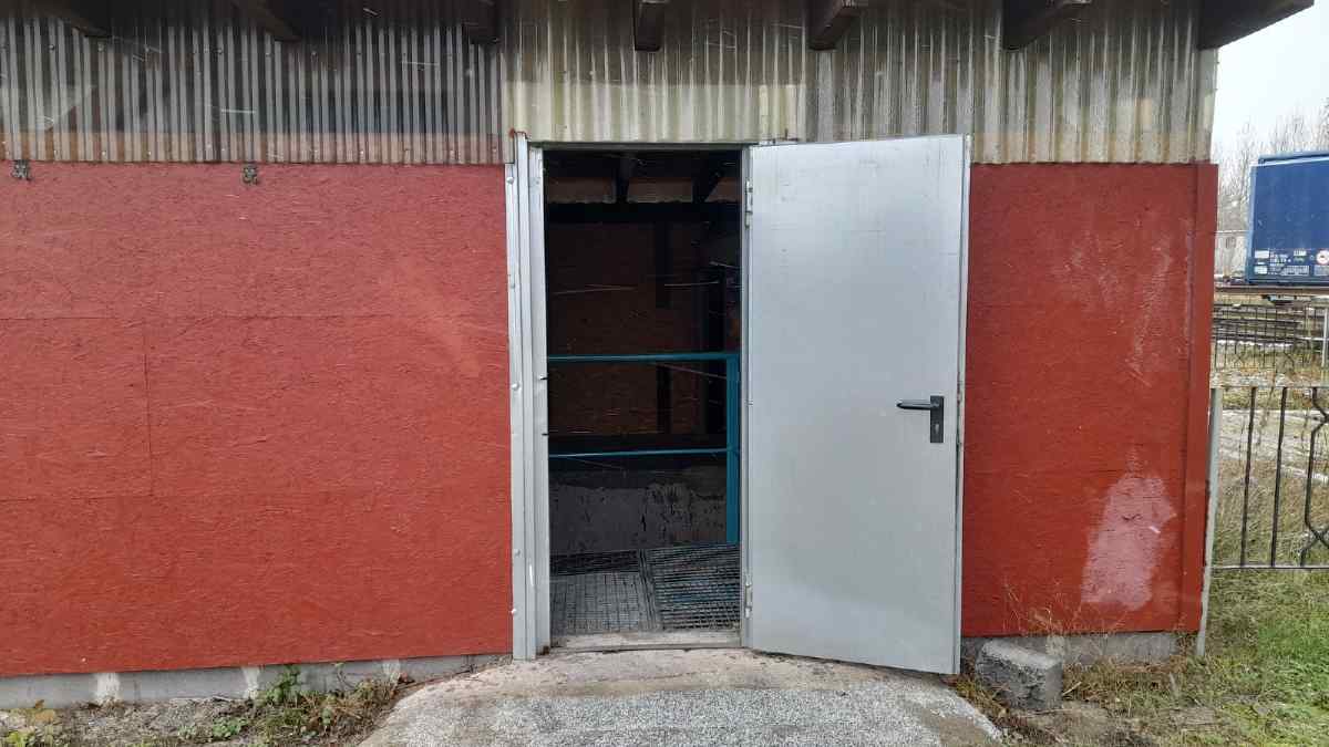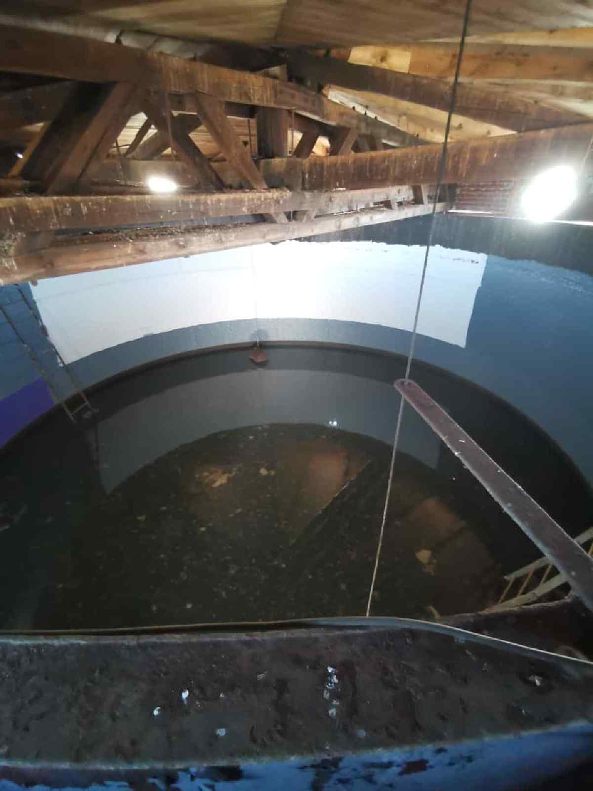 If you open the entrance door, you get into the shaft of the tower. Here you can see thick pipes in the middle that reach vertically from the floor to the ceiling. There are three pipes in total. Groundwater from our well system is pumped up into the storage tank through one of them. Through the other two pipes, water rushes down from the storage tank when one of the three water cranes located in the compound is opened.