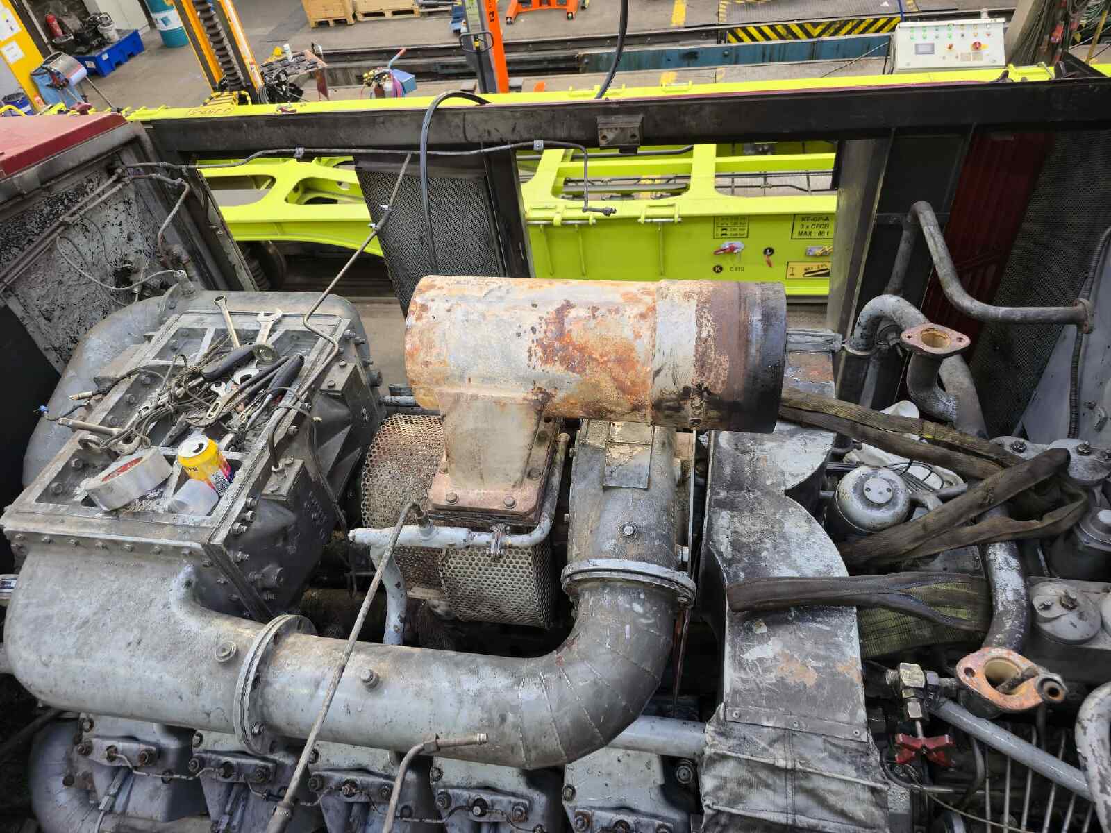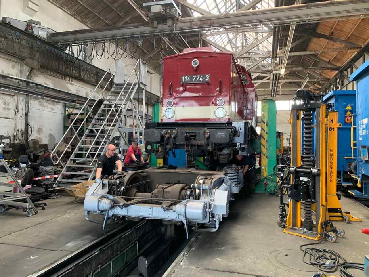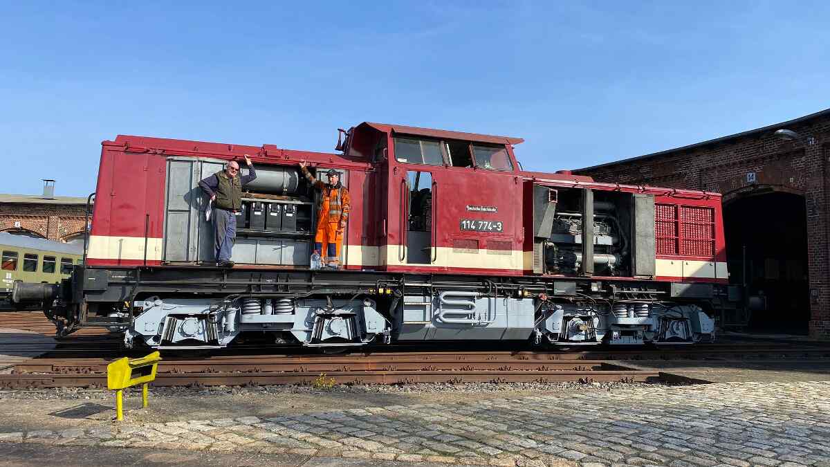 Wir berichteten bereits des Öfteren über die Aufarbeitung unserer Diesellok der Gattung V100.1, die die Nummer 114 774-3 trägt. Nachdem wir uns bereits vor einiger Zeit um das Fahrwerk und die Bremse der Lok gekümmert hatten, stand in den letzten Wochen der Motor im Mittelpunkt des Interesses. Für die Technik-Enthusiasten sei erwähnt, dass es sich um ein Aggregat des Herstellers VEB Kühlautomat Berlin-Johannistal handelt. Es erzeugt mit seinen 12 Zylindern und dem Turbolader eine Leistung von knapp 1.500 PS. Damit handelt es sich um die leistungsstärkste Motorvariante, die in Lokomotiven dieses Typs eingebaut wurde. Zwar war unser Motor seit der letzten großen Instandsetzung vor einigen Jahren nur ein paar Dutzend Betriebsstunden gelaufen. Allerdings waren im Laufe der langen Standzeit seit der Abstellung der Lok durch den letzten kommerziellen Eigentümer einige Undichtigkeiten am Turbolader aufgetreten, die zum Austritt von Öl führte. Bevor wir die Lok wieder einsetzen können, mussten diese Undichtigkeiten beseitigt werden. Dazu wurde der Turbolader und diverse andere Anbauteile aus dem Motorraum entfernt, um sie aufarbeiten zu können. Nachdem die Aufarbeitungen abgeschlossen waren, konnten sich unsere Diesellokfachleute wieder mit dem Zusammenbau beschäftigen. An diesen kleinen Bericht sind ein paar Fotos von der Aktion beigefügt. Wir danken an dieser Stelle herzlich den Schienenfahrzeugwerken Wittenberge für die Unterstützung. Demnächst werden die Arbeiten abgeschlossen. Wir freuen uns schon auf den Probelauf des Motors und der Lokomotive.