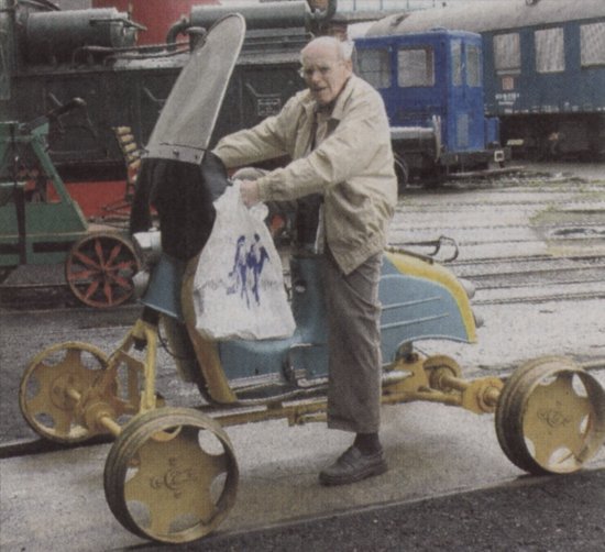 Ein Moped auf Schienen: Erich Graf aus Klötze beim Probesitzen. |