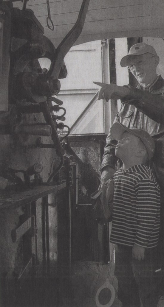 Alfred Rohloff aus Maxdorf besichtigt mit seinem Enkel Johannes (viereinhalb Jahre) den Führerstand der Rangierlok "Emma". |